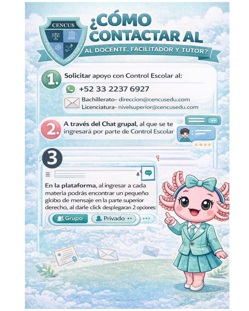 ¿Comó ingreso a la plataforma? ¿Comó navegar en la plataforma, consultar los materiales de estudio y apoyo? ¿Comó y donde consultar mis calificaciones? ¿Comó subir/cargar actividades en la plataforma? ¿Comó ingreso a FORO? Medios para contactar y gestionar al docente/ facilitador y tutor ¿Comó contactar y gestionar trámites en control escolar? ¿Comó verifico la BIBLIOGRAFÍA de mis asignaturas? ¿Comó acceder a la Biblioteca Digital? Estudiantes 0 Carreras y Diplomados 0 Generaciones 0 Docentes 0